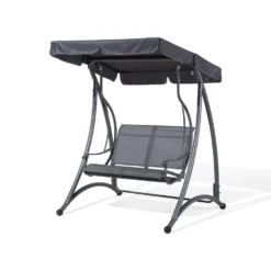 Comfortabele schommelbank in grijs. Deze comfortabele en aantrekkelijke 2-zits tuinschommel biedt een romantisch en comfortabel zitgedeelte voor de buitenruimte. Het geïntegreerde, instelbare zonnescherm, gemaakt van grijs, duurzaam polyester, zorgt voor aangename schaduw. De zonnekap is afneembaar en kan op 30°C worden gewassen. Het stevige en gebogen frame van grijs, gepoedercoat staal staat op vier stevige poten en geeft de schommel een moderne uitstraling. Maak het jezelf gemakkelijk op zonnige dagen!