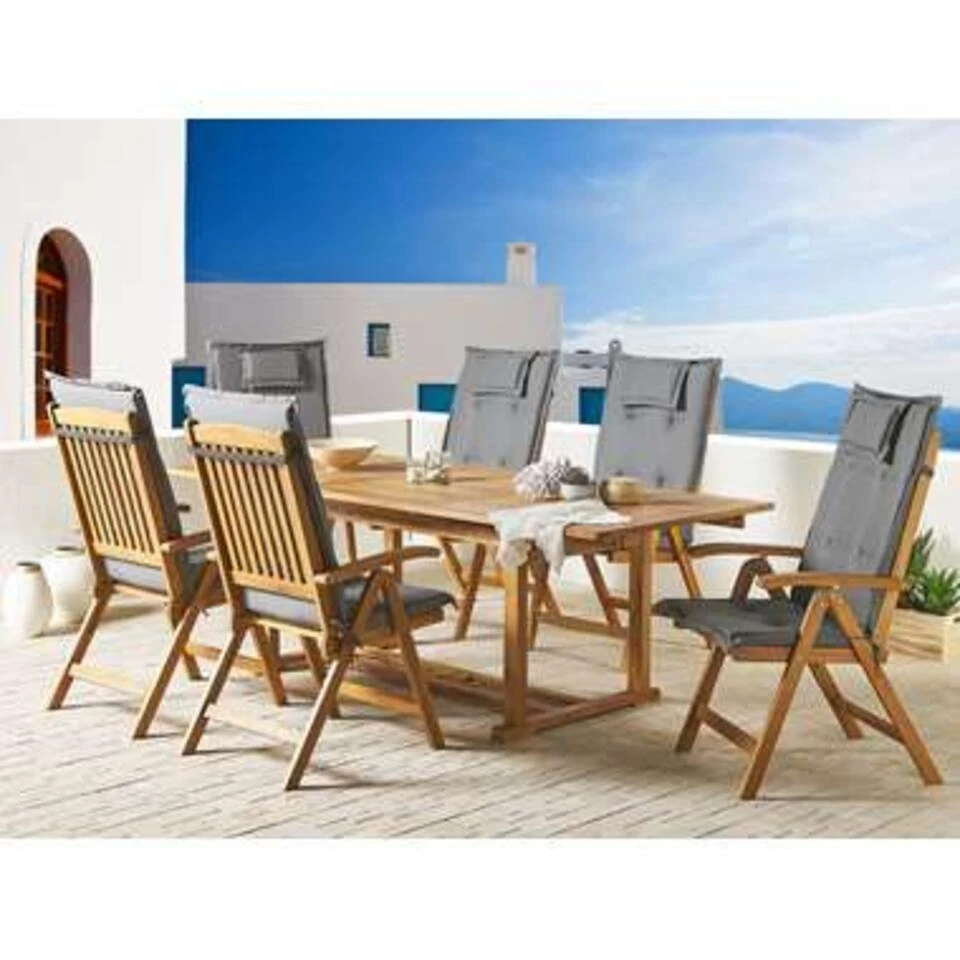 Belangrijkste eigenschappen: Rugleuning verstelbaar in 6 posities, Tafelblad met gat voor parasol, Praktische touwtjes voor gemakkelijke bevestiging aan de zitting, Perfect gevormde armleuningen, UV-bestendigheidsklasse 5 (ISO 105-B02), Gemaakt van natuurlijk resistente materialen, Ruimtebesparend inklapbaar