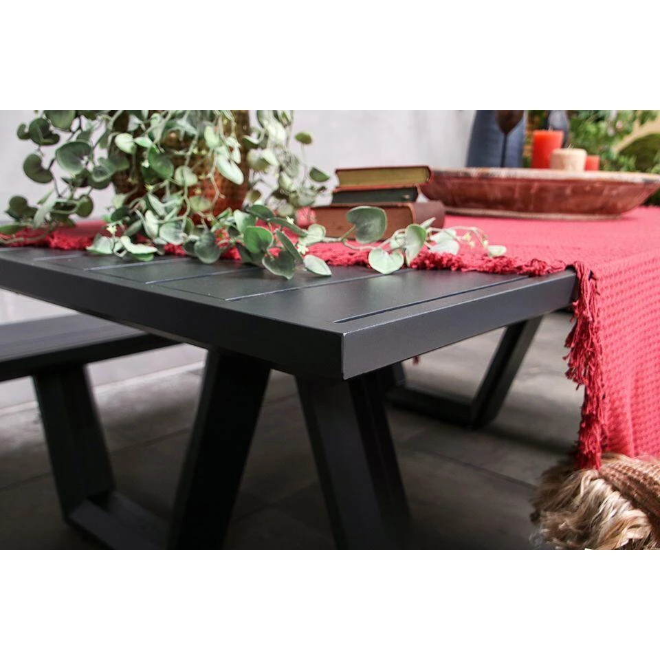 Strakke stijl en optimaal genieten? Deze picknickset heeft een royale grootte en design van aluminium met antracietgrijze coating, wat zorgt voor een moderne stijl. Ga heerlijk buiten genieten van uw lunch of diner met familie en vrienden in deze Dax picknickset. Mooie detail aan de Dax picknickset is het tafelblad en zittingen en poten in facetvorm wat zorgt voor een robuuste look.