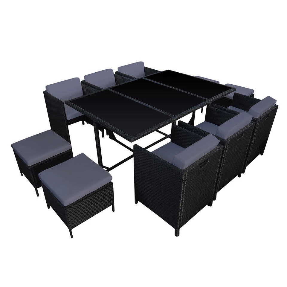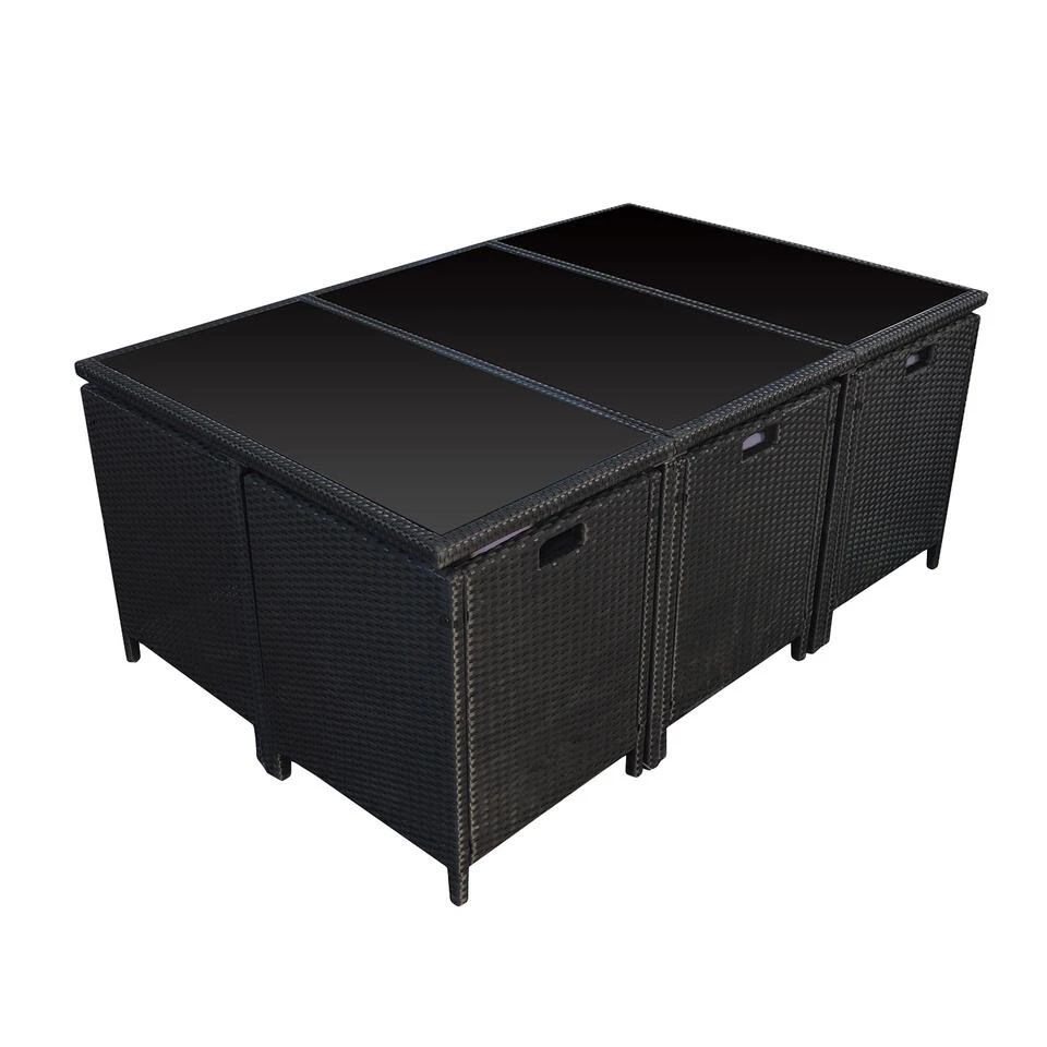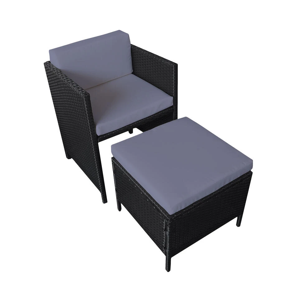 Met de SANTORIN tuinmeubelen van geweven hars kunt u aangename momenten doorbrengen met uw familie of vrienden. De grijze kussens zijn zeer comfortabel en passen perfect bij de zwarte kleur van de hars. Hij bestaat uit 6 fauteuils en 4 krukken en biedt plaats aan 10 personen. Het ziet er geweldig uit in elke buitenomgeving.