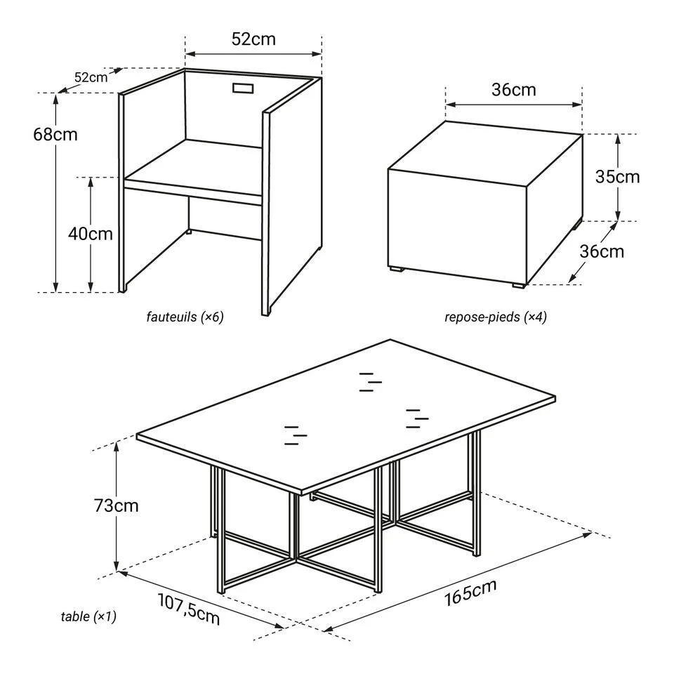– Maximaal ondersteund gewicht: 150kg (fauteuils) / 80kg (tafel) / 100kg (voetenbankjes)