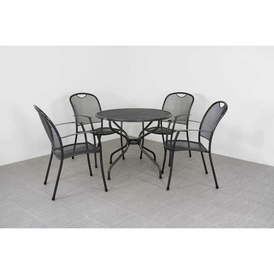 De Kettler Kos tuinstoel is gemaakt van een metaal gecoat frame. Deze coating is antraciet van kleur en zorgt ervoor dat de tuinstoel een extra lange levensduur heeft. De Kettler Kos is stapelbaar wat ervoor zorgt dat de tuinstoelen compact op te bergen zijn. De Kos tuinstoel is de opvolger van de Calvia dining tuinstoel. De strekmetaal tuintafel is rond. Dit zorgt ervoor in de tuinset dat je iedereen aan de ronde tuintafel aan kan kijken. Dit creeert een gezellig sfeer. De tafel is net als de stoelen gemaakt van gecoat staal.