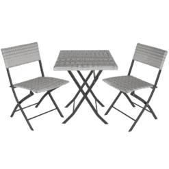 Deze driedelige ratanset van tectake overtuigt met een chique look, hoge flexibiliteit en veel gezelligheid. De compacte zitgarnituur is ideaal geschikt voor kleine balkons, terrassen of nissen. Indien niet in gebruik, kunnen de afzonderlijke elementen ruimtebesparend gevouwen worden. De tafel alsook de beide stoelen van gepoedercoat staal en het fijne vlechtwerk van duurzaam polyraten worden klaar gemonteerd geleverd. De combinatie van robuust frame en laag gewicht maken deze onderhoudsvriendelijke ratanset van tectake perfect voor transport en de camping.