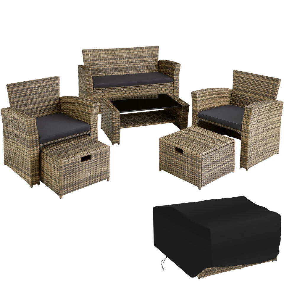 Deze uitnodigende wicker zitgroep van tectake combineert op geslaagde wijze chique design met veel comfort. De zachte zitkussens en de krukken als voetsteunen zorgen voor ontspannen momenten in de woonkamer in open lucht. Als ze niet worden gebruikt, kunnen de krukken gewoon onder de stoelen worden geschoven en de waterafstotende kussens handig in de bank worden opgeborgen. Door het hoogwaardige vlechtwerk van duurzaam wicker en het robuuste onderframe van staal overtuigt de onderhoudsvriendelijke wicker zitgroep van tectake ook met haar „innere waarden“.