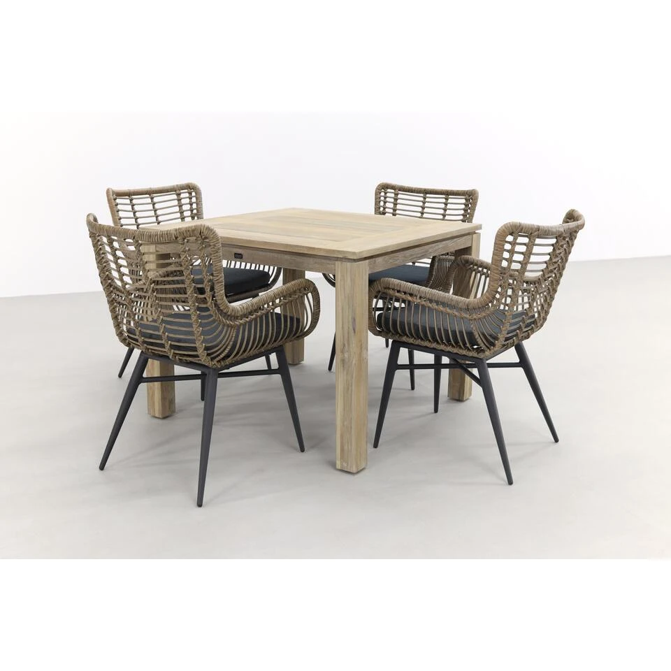 Wil jij graag een vintage tuinset die niet al te veel ruimte in beslag neemt? Dan is deze Jasmine natural/Rome tuinset de juiste keus voor jou! De Jasmine tuinstoelen hebben een mooie uitstraling door het natural wicker dat om het frame is gevlochten. Door de vlinder vorm van deze stoel krijg je een hele open uitstraling wat echt die retro vibe geeft. De Rome tuintafel is gemaakt van massief teakhout. Het teakhout is behandeld met een grey wash, waardoor het die mooie grijze gloed heeft gekregen. Deze kleuren passen perfect bij elkaar! De vierkante tuintafel heeft een lengte van 100 cm. waardoor hij lekker compact is. Ideaal voor een kleinere tuin of balkon! Weet jij al waar jij hem gaat plaatsen? Bestel dan direct online!